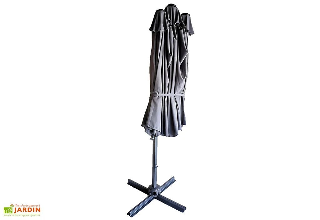 La grande envergure du parasol nécessite une stabilité assurée par un socle de base en croix pour lequel il suffira d’ajouter des poids (non inclus). Il peut recevoir des dalles de 50 x 50 cm. La grande toile se manœuvre avec une manivelle qui permet de contrôler l’ouverture et la fermeture en un instant, sans effort.