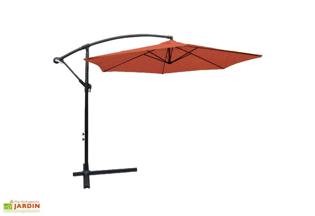 Ce parasol excentré est doté d’une solide structure en aluminium qui ne craindra ni l’humidité, ni la corrosion, même sans entretien. Le tout est rotatif et ne pèse que 10 kg, vous permettant ainsi de déplacer facilement le parasol si besoin. La base chargée d’assurer la bonne stabilité de l’ensemble est également incluse.