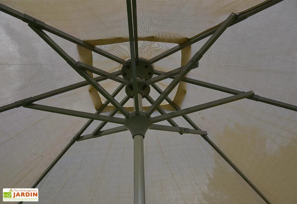 Le parasol dispose d’un mat en aluminium de 48 mm de diamètre et de 1,2 mm d’épaisseur. L’aluminium ne craint pas la corrosion, c’est un matériau naturellement résistant à la rouille. Il ne demande pas d’entretien. La tête du parasol est soutenue par 8 baleines en aluminium de 18 x 28 mm de section et 1,2 mm d’épaisseur.