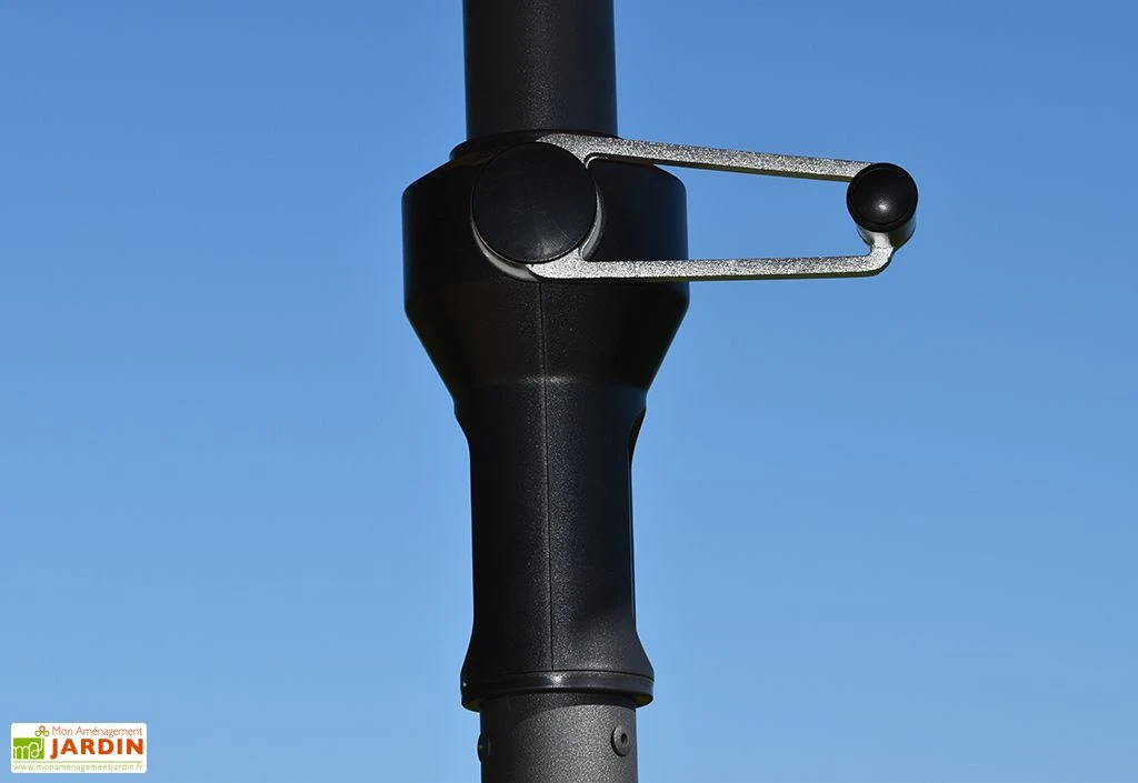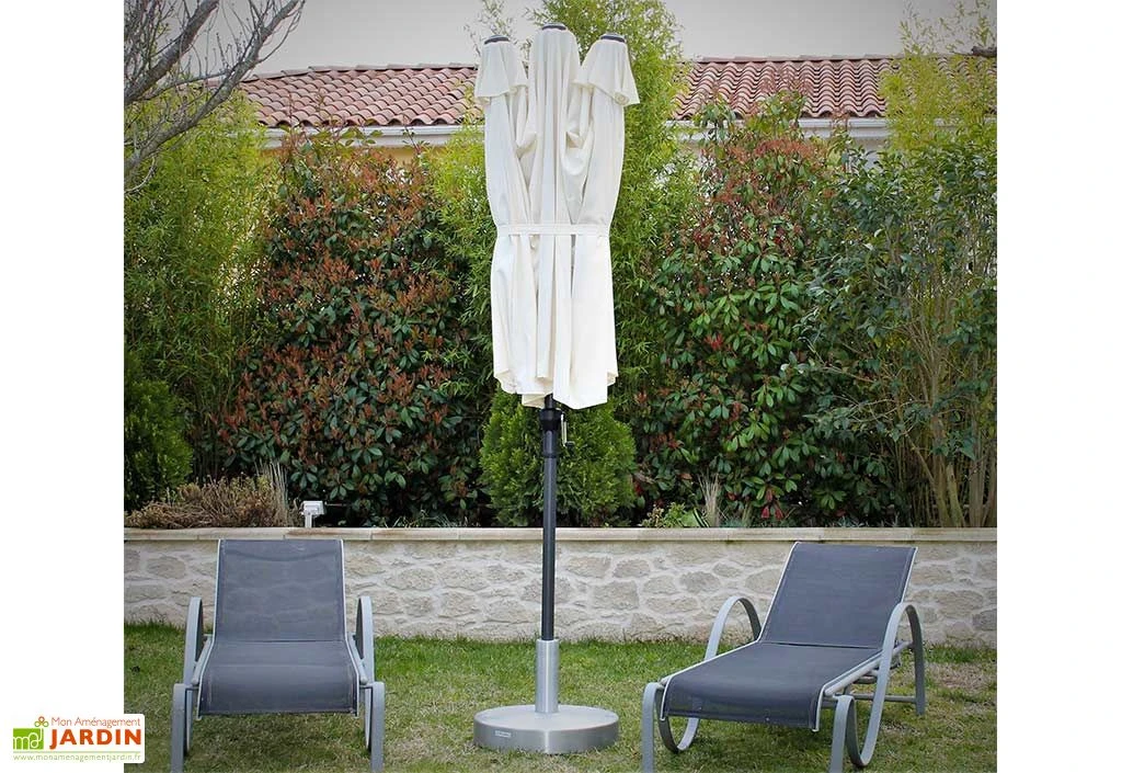 Le parasol dispose d’un mat droit en aluminium de 48 mm de diamètre. Résistant, l’aluminium ne craint pas la corrosion et ne demande donc aucun entretien. 12 baleines permettent de supporter les 3 têtes de parasol et d’assurer leur solidité. Elles mesurent 12 x 18 mm de section.