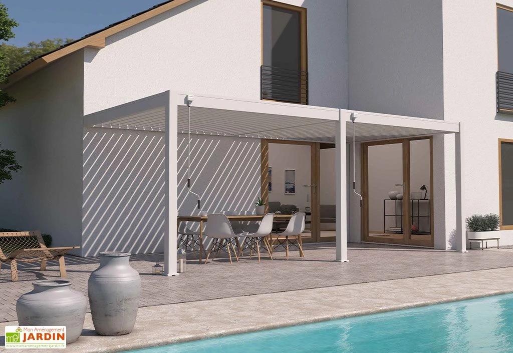 Sa toiture est composée de 38 doubles lames orientables en aluminium blanc que vous pouvez orienter manuellement jusqu’à 135° grâce à deux manivelles incluses. Chaque manivelle pourra contrôler une partie de la toiture indépendamment de l’autre. Les lames sont étanches et un système de drainage évacue l’eau de pluie à l’intérieur des poteaux. Des extensions sur les poutres cachent les lames en position ouverte, offrant une finition parfaite.