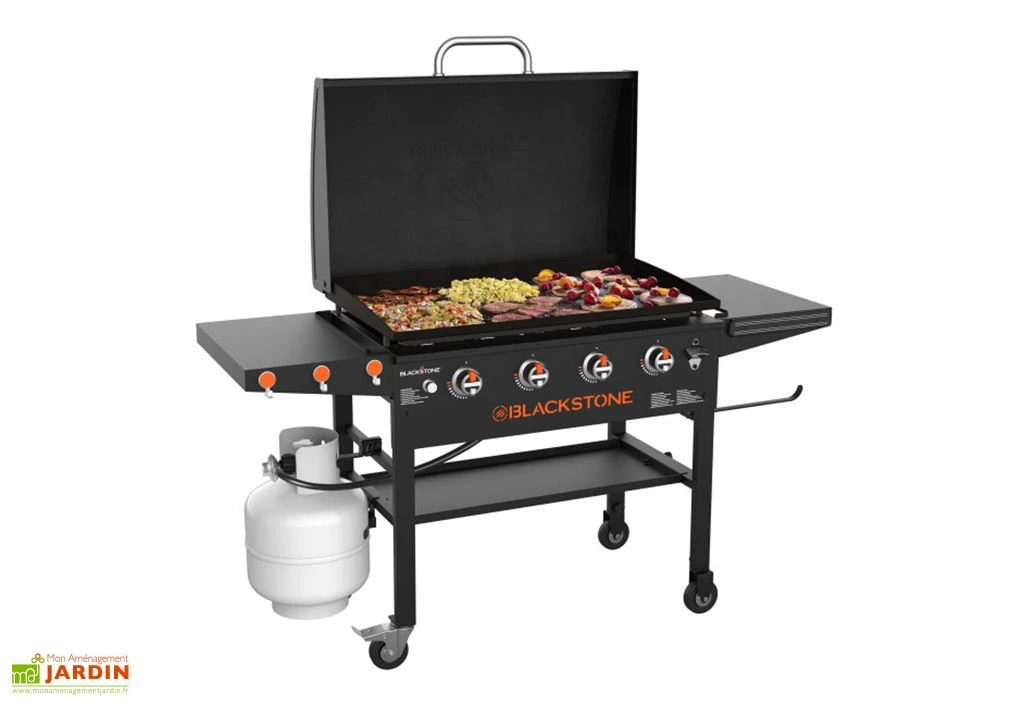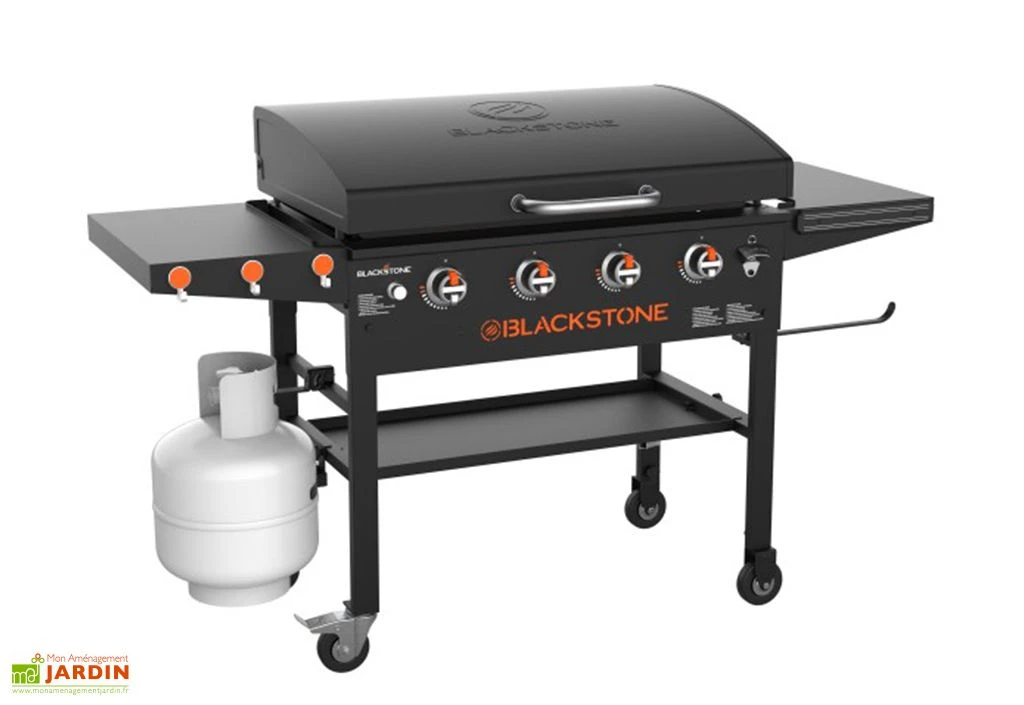 Cette plancha à gaz de la marque Blackstone est équipée d’un couvercle amovible chargé de protéger la plaque de cuisson lorsque vous ne l’utilisez pas, mais qui contribuera également à la bonne gestion et à la réussite de vos cuissons ! Elle possède une surface de cuisson de 91 cm de diagonale et mobilise une plaque en acier laminé qui assurera une répartition de la chaleur parfaitement homogène.