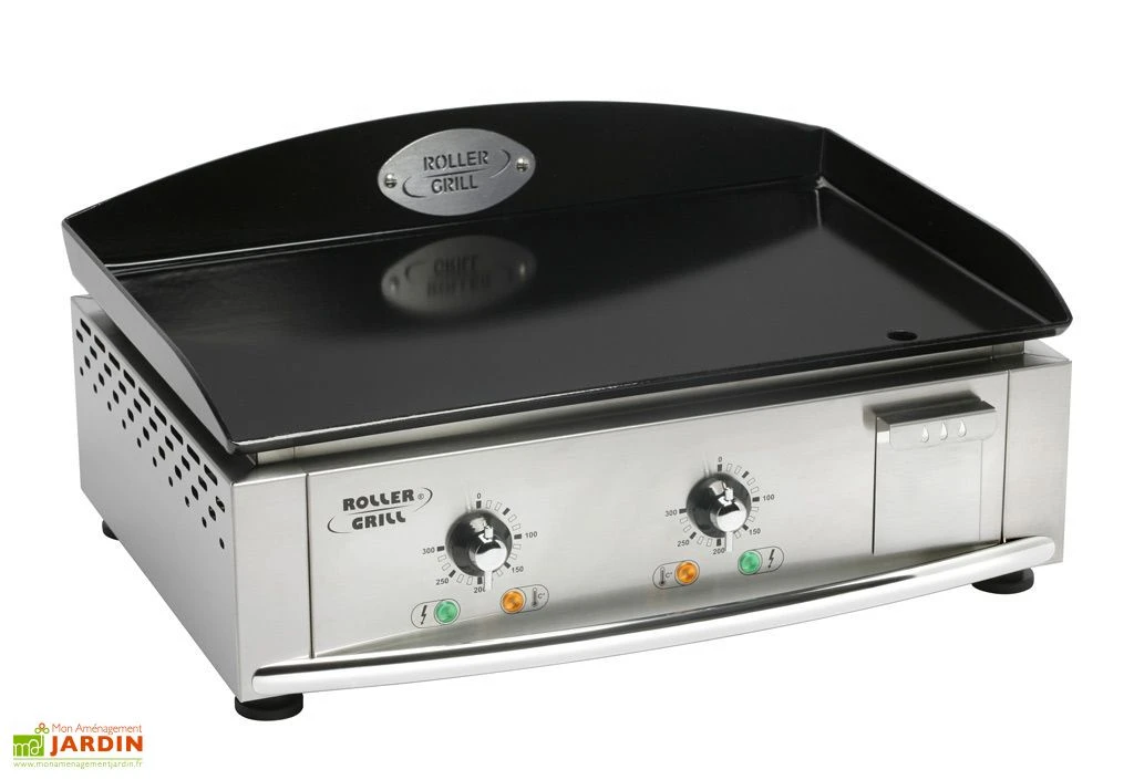La plancha de chez Roller Grill est une plancha électrique qui possède une puissance de 3500 Watts. Elle est fabriquée en France et dispose d’une plaque de cuisson en acier émaillé de 59 x 38 cm. La plancha mesure 43 cm de longueur, 60 cm de largeur et 28 cm de hauteur. Sa structure est en inox. Elle est équipée de résistances incoloy en serpentins. Elles couvrent la totalité de la surface de la plancha ce qui vous offre une cuisson homogène.