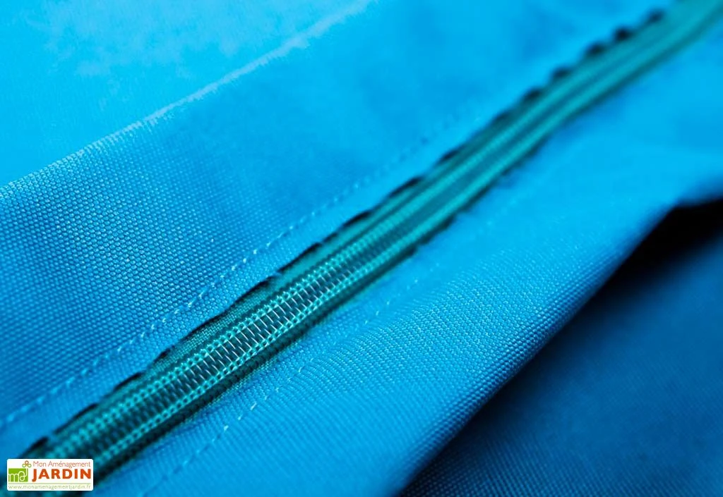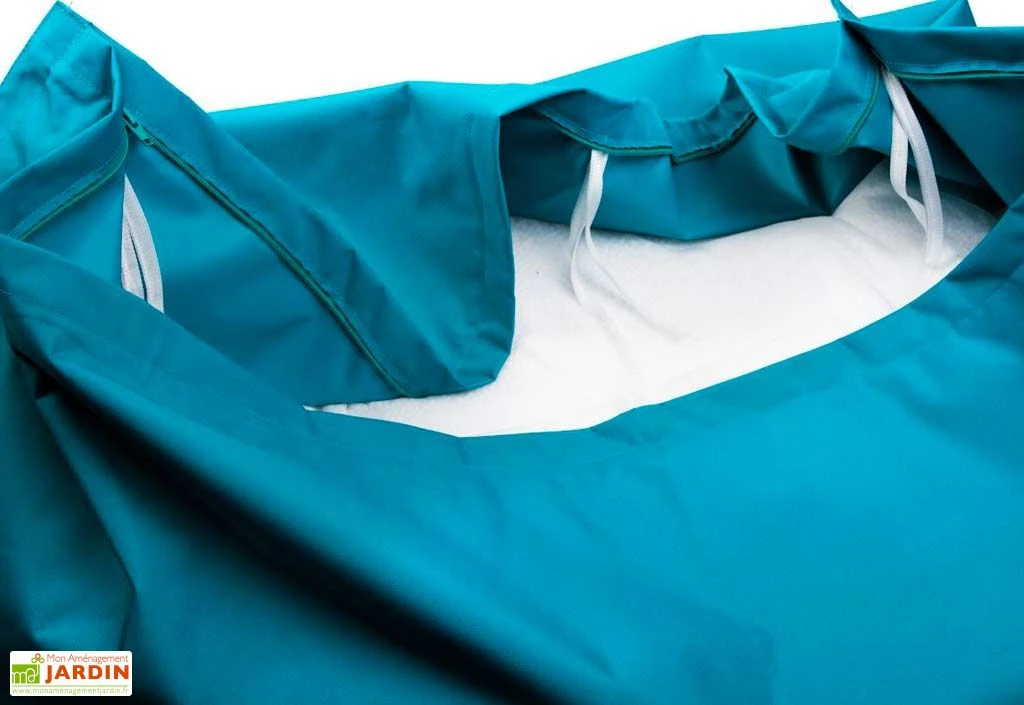 Le pouf extérieur est composé d’une housse en polyester enduit de PVC déperlante et rempli de billes de polystyrène vierge. Les 380 litres de billes qui le composent lui offrent une assise confortable que vous pourrez modeler facilement. Pratique, il est déhoussable et se lave en machine. La housse a bénéficié d’un traitement anti-UV et anti-feu.