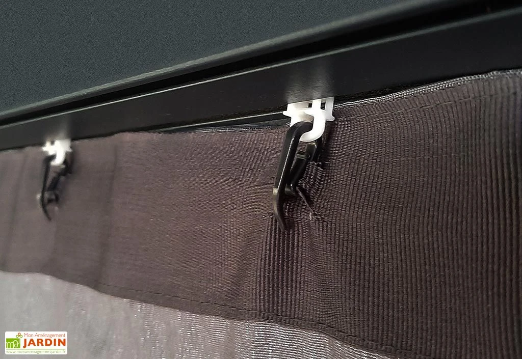 Les rideaux sont faciles et rapides à installer. Il suffit de clipser les crochets (inclus) sur les rails de la tonnelle puis de les fixer aux crochets. Les crochets et les rails permettent de faire glisser facilement les rideaux tout le long de la tonnelle.