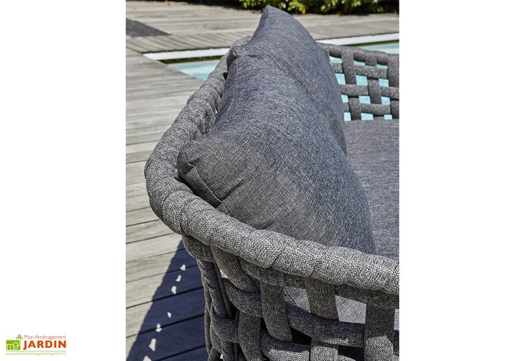 Le canapé et les fauteuils arborent un revêtement fait de cordes en PVC tressées et disposent de coussins en polyester imperméabilisé. Ces coussins sont déhoussables afin d’être nettoyés aisément si besoin. L’ensemble se montrera très confortable et grâce à son design à la fois moderne et élégant, ce salon de jardin s’intègrera facilement dans votre extérieur.