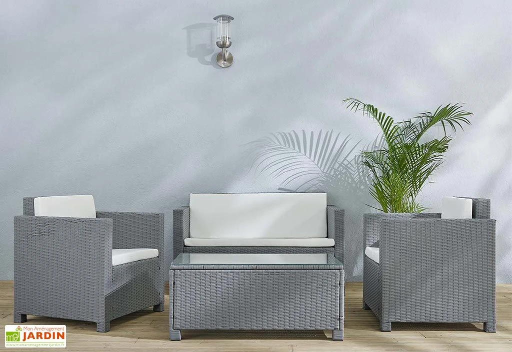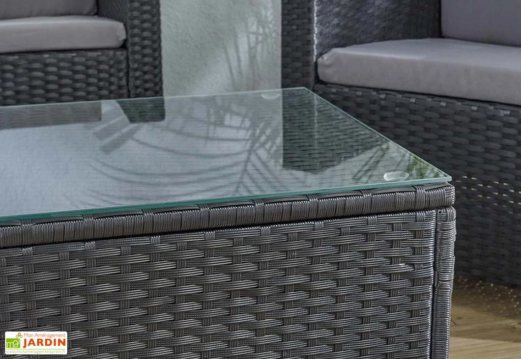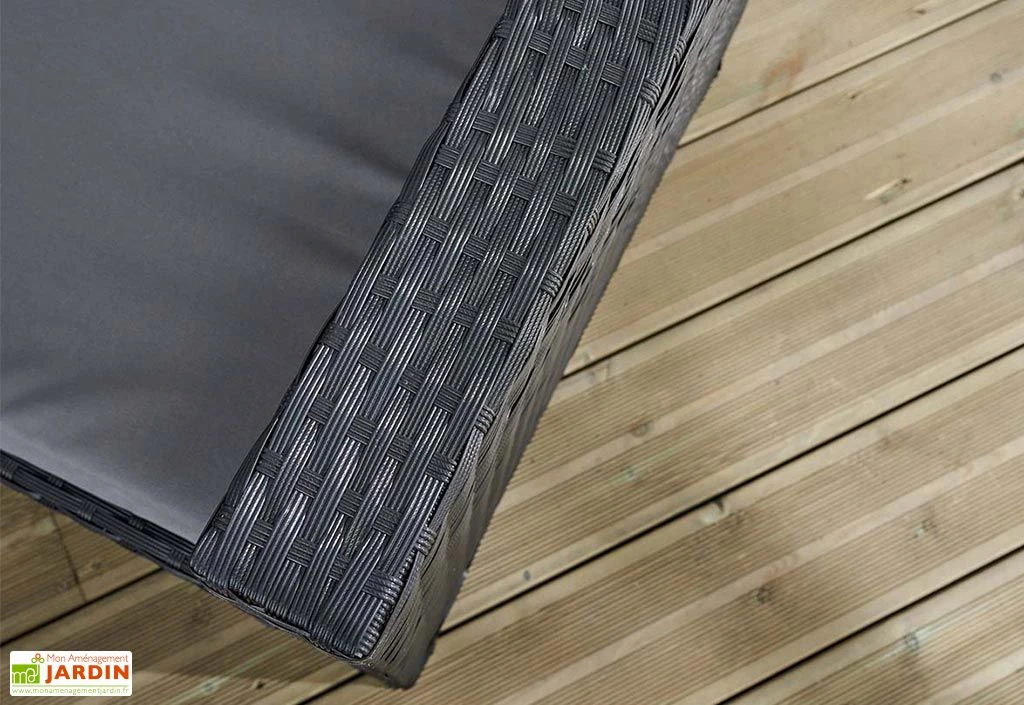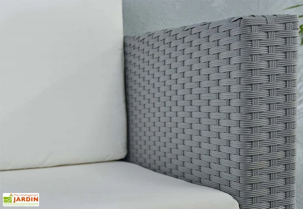 Les divers éléments qui composent ce salon de jardin 4 places possèdent une solide structure en aluminium revêtue de résine tressée disponible dans deux coloris au choix : noir ou gris. Robuste et insensible à la rouille, l’aluminium n’exige aucun traitement ni entretien, tout comme la résine qui ne décolorera pas et se montrera facile à nettoyer. L’aluminium est de plus relativement léger, vous permettant ainsi de déplacer facilement votre salon de jardin.