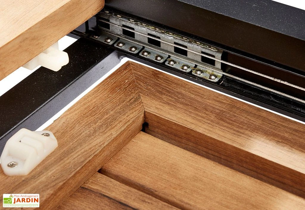 Le salon de jardin Bali se compose d’une table en aluminium noir avec un plateau en Teck. La table mesure 150 x 100 x 76 cm (l,l,h) et dispose d’une rallonge permettant de passer de 150 à 240 cm de long. Elle permet d’accueillir de 6 à 10 convives.