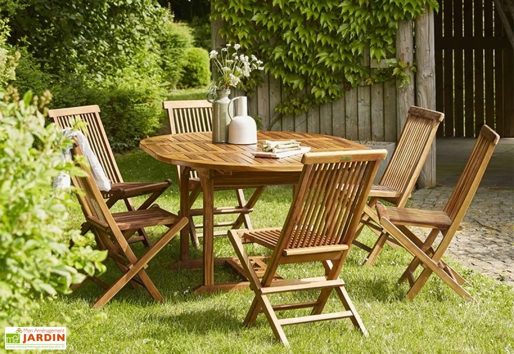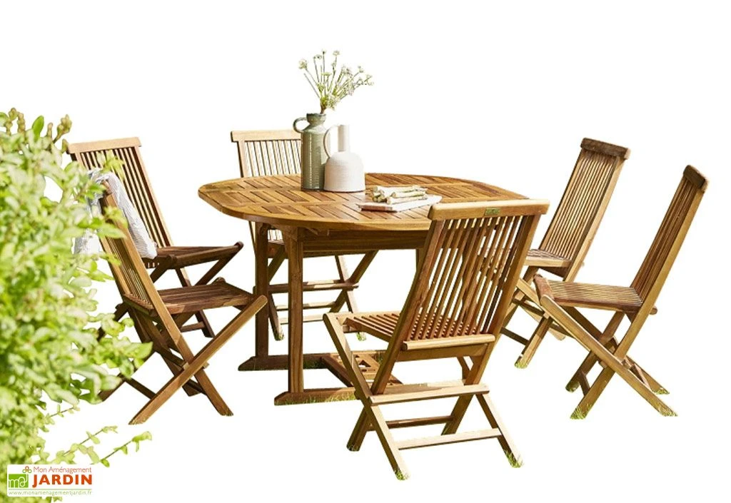 L’ensemble de mobilier de jardin est composé d’une table et de 6 chaises. La table est modulable grâce à sa rallonge très simple d’utilisation et peut accueillir entre 4 à 8 personnes.