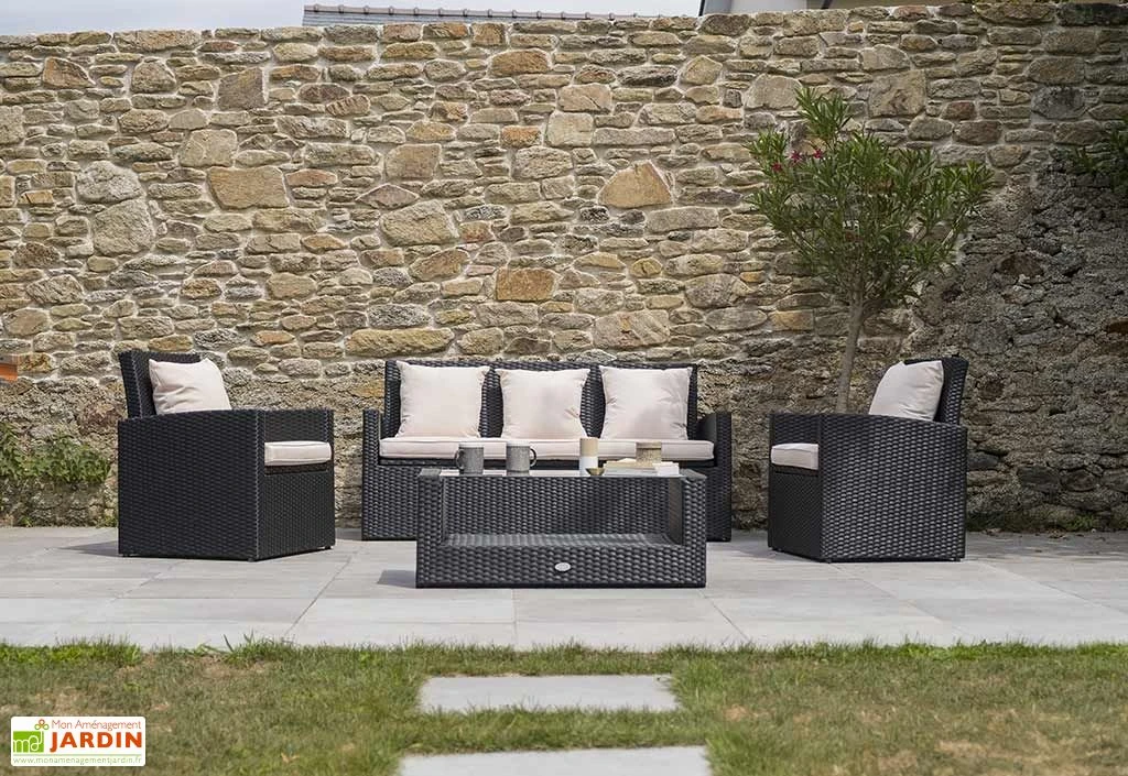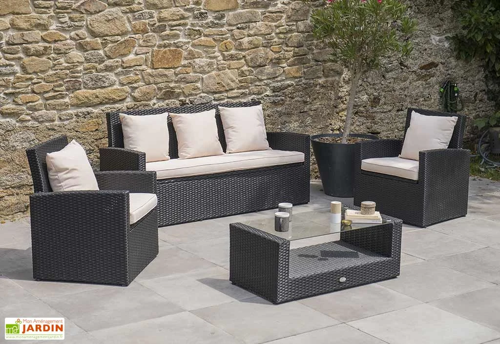 Votre salon de jardin en résine tressée se compose d’un canapé trois places, de deux fauteuils et d’une table basse. La résine tressée, de coloris noir, recouvre une armature robuste en acier et résiste aux UV et aux intempéries. Le canapé et les fauteuils disposent d’une assise en mousse (25kg/m3) et de coussins avec un intérieur en coton (180kg/m2). Le tout est recouvert d’une toile 100% polyester écru.