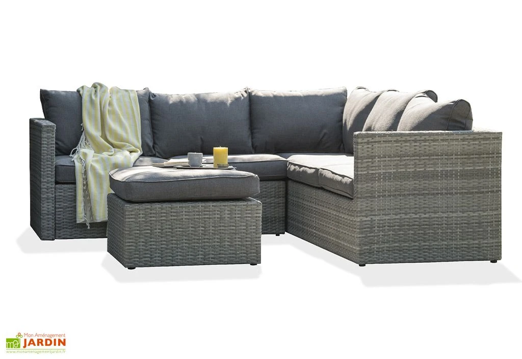 Votre salon de jardin de chez DCB Garden a une structure en aluminium avec un revêtement en résine grise. Le salon se compose d’un canapé 3 places de 208 x 72 x 64 cm (l,l,h), d’un canapé 2 places de 134 x 72 x 64 cm (l,l,h) et d’une table/pouf de 61,5 x 60 x 31 cm (l,l,h). Les coussins sont anthracite et la garantie est de 2 ans.