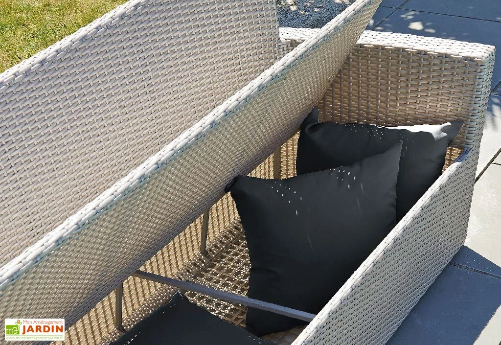 Votre salon de jardin de chez DCB Garden en résine tressée grise comprend une table basse, deux fauteuils et une banquette trois places. Les fauteuils et la banquette sont équipés d’un rangement sous l’assise. La table possède un plateau en verre trempé transparent. La structure est en acier. Les coussins sont en polyester avec un intérieur en coton de 180 kg/m2. Les fauteuils de 66 x 64 x 79 cm (l,l,h) sont livrés avec des coussins anthracites. La banquette mesure 160 x 64 x 79 cm (l,l,h). La table mesure 93 x 49,5 x 37 cm (l,l,h). La garantie est de 2 ans.