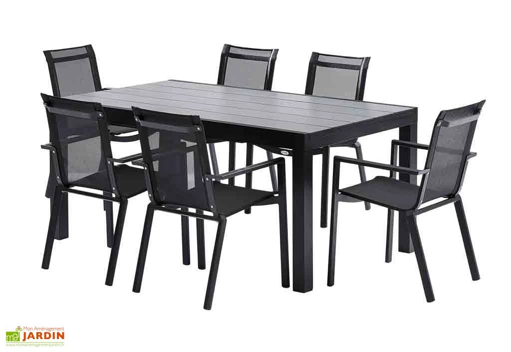 La table à manger a une dimension de 170 cm de long par 100 cm de large et 76 cm de haut, et peut atteindre une longueur de 260 cm grâce à sa rallonge. Les sièges mesurent 61 x 57 x 87 cm (l,l,h). Le salon de jardin est garanti 2 ans.