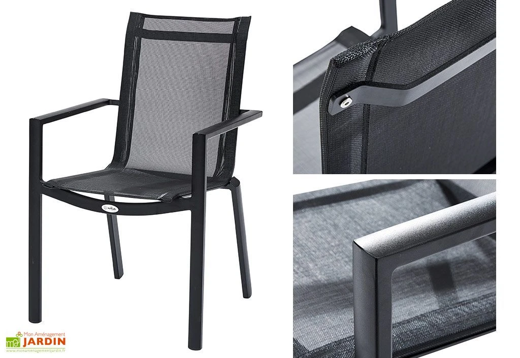 Les 8 fauteuils en aluminium possèdent une assise en textilène leur assurant confort et résistance. Ils mesurent 57 x 61 x 87 cm (l,l,h). Le HPL et le textilène sont des matériaux très utilisés pour le mobilier de jardin grâce à leurs propriétés de grande résistance.