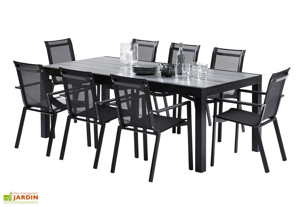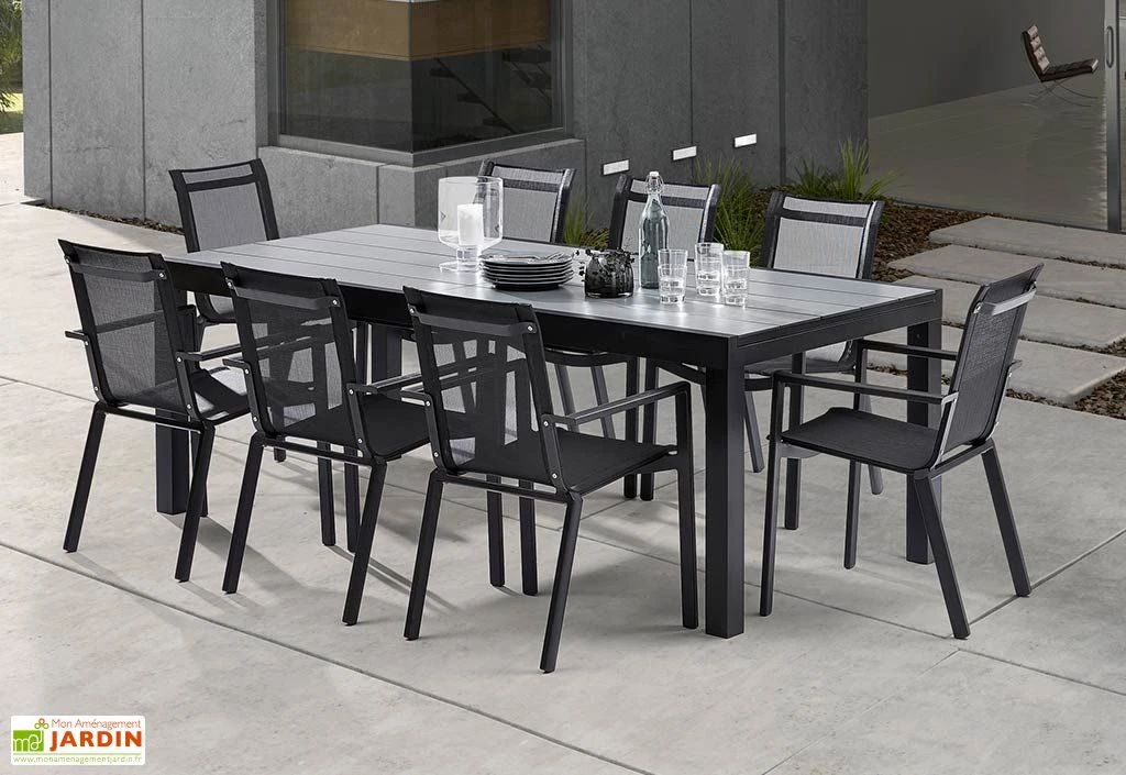 La table de ce salon de jardin possède une structure en aluminium noir et un plateau en HPL (stratifié haute pression) gris clair. Elle mesure 210 cm par de long par 100 cm de larg et 76 cm de haut. Une fois la rallonge déployée, elle atteint une longueur de 330 cm.