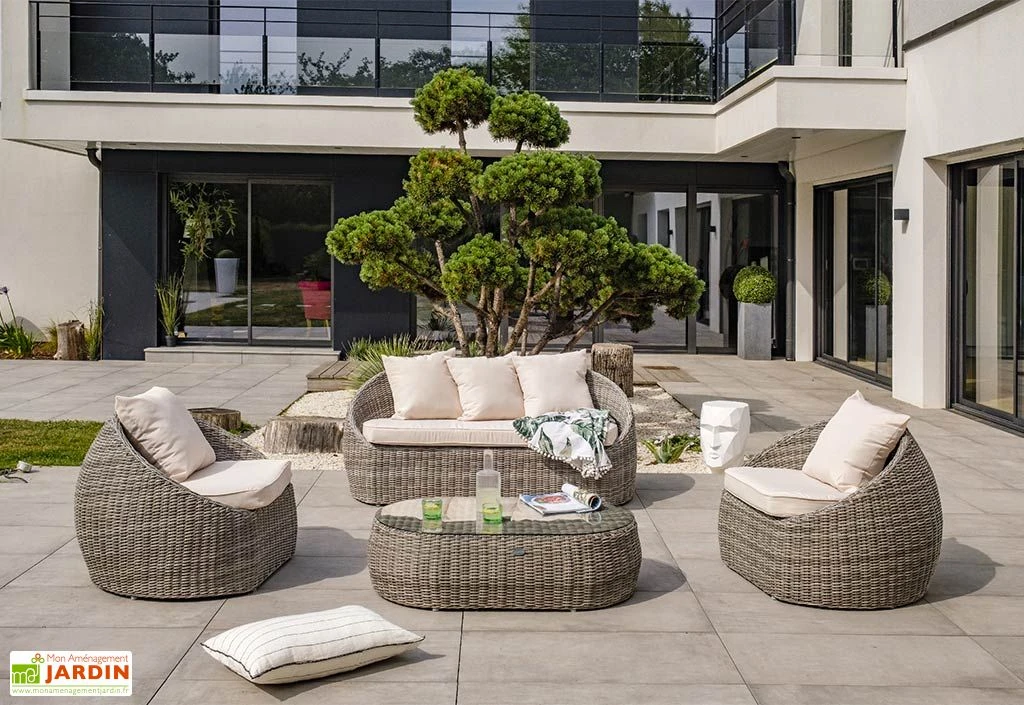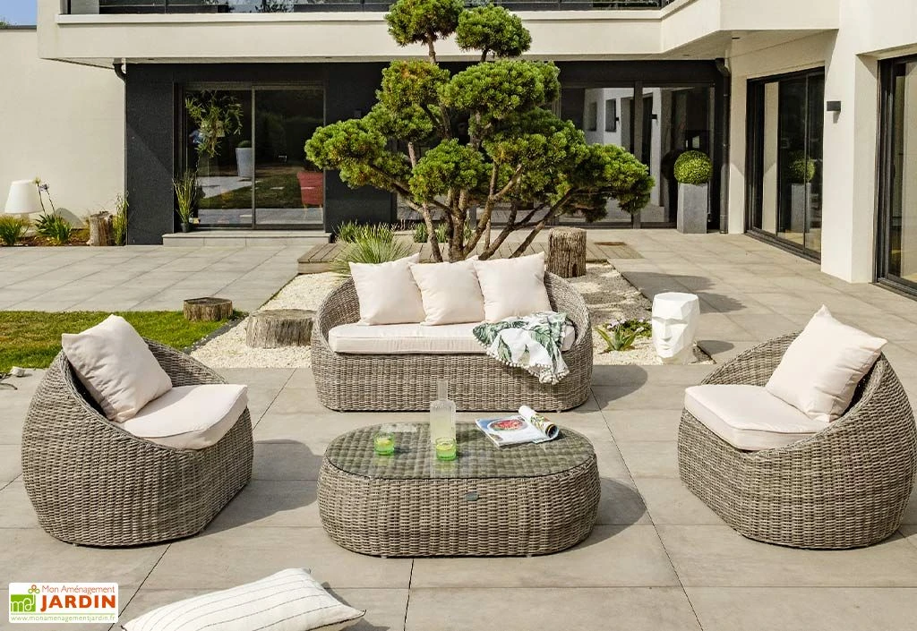 Le salon de jardin Isa en résine tressée demi ronde grise de chez DCB Garden aménage votre jardin avec sobriété et confort.