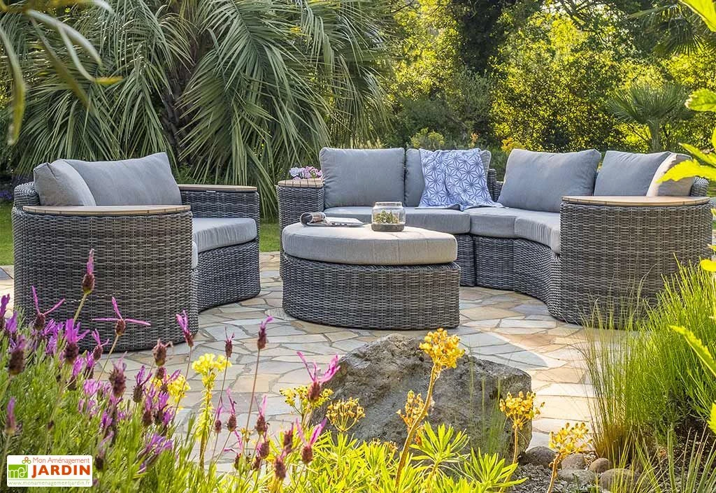 Chaque méridienne et le canapé sont équipés de grands rangements sur les côtés, permettant de stocker des magazines, de la vaisselle ou n’importe quel objet pour le garder toujours à portée de main. La petite table sert aussi bien de table basse, sans coussin, que de pouf, avec le coussin, pour créer une à deux assises supplémentaires et bénéficier ainsi d’un grand salon de jardin jusqu’à 10 places.