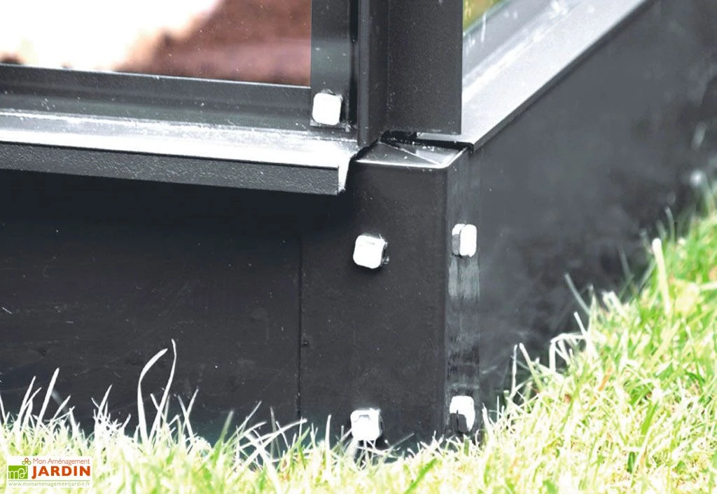 La serre en verre comprend également une base en acier galvanisé. Cette embase, résistante à la corrosion également, permet de surélever la serre de 6 cm et d’en protéger la structure. Elle stabilise l’ensemble tout en la solidifiant. La base vous permet en plus d’installer la serre directement sur la terre. Elle comprend des pieds d’ancrage (fixations pour le sol non incluses : à choisir selon la nature du sol).