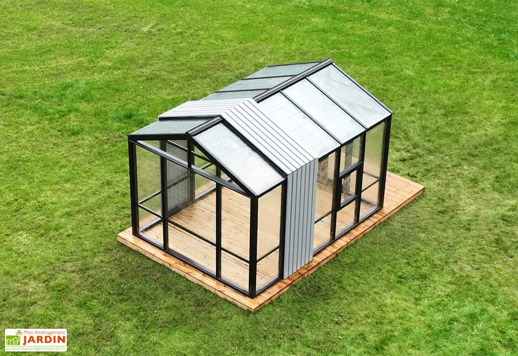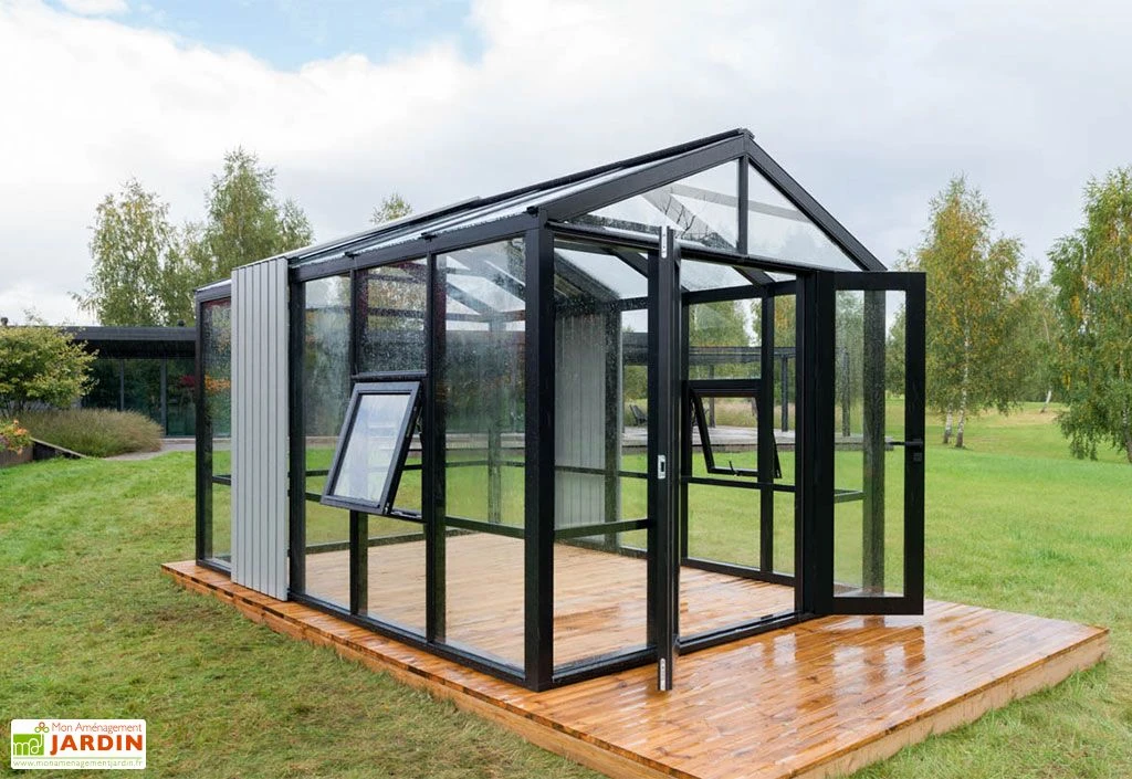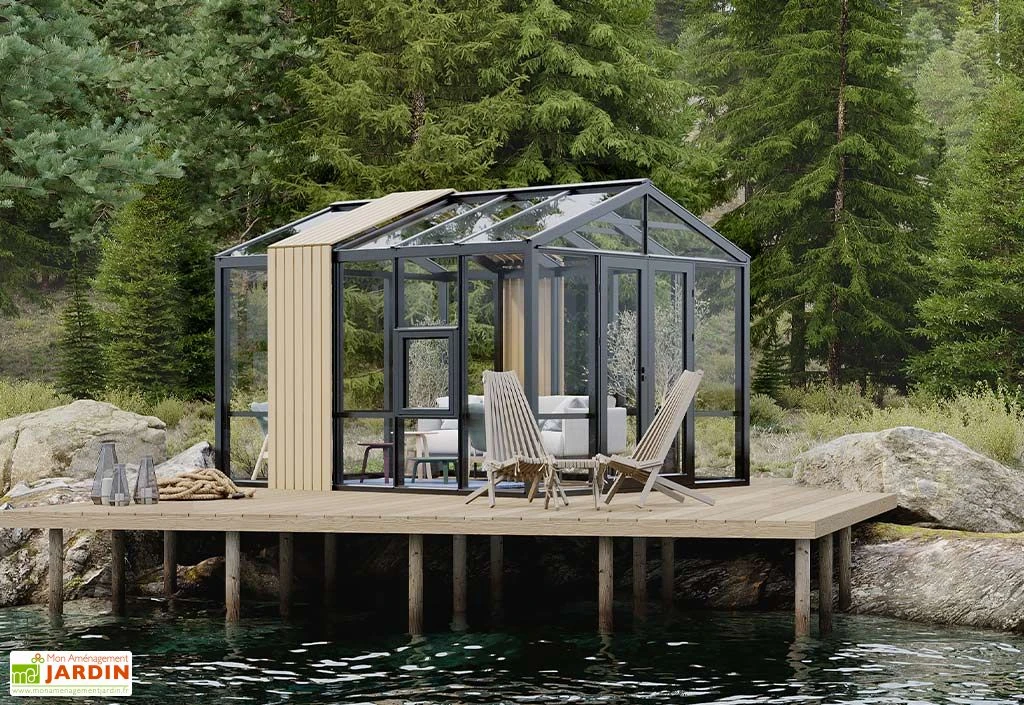 Cette serre de jardin fabriquée en Lettonie est proposée par Stali. Elle combine une structure en bois de pin, des parois en verre trempé et un panneau occultant en bois qui, en plus de lui offrir un design moderne et original, proposera un coin d’ombre sous la serre.