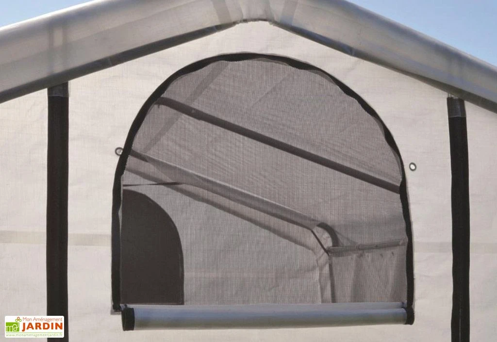 La serre de jardin est équipée d’une porte de 100 cm de largeur et 150 cm de hauteur. Elle dispose de deux fermetures à glissière. Pour éviter l’humidité à l’intérieur de la serre, elle est également équipée de 2 fenêtres. Une première se situe au-dessus de la porte et une deuxième sur la paroi du fond. Les parois latérales, quant à elles, peuvent être relevées et enroulées afin de créer deux aérations sur les côtés, idéales pour contrôler la température à l’intérieur de l’abri.