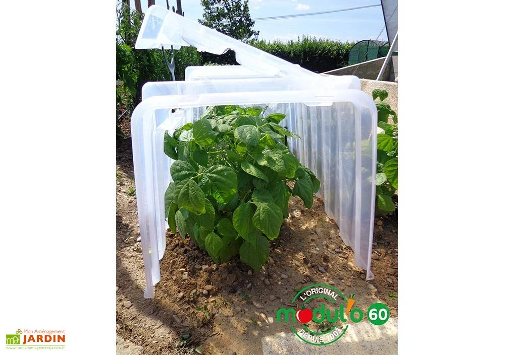 La serre de jardin Tunnel de Culture Modulo 60 Pouss’vert de chez Modul’o en polypropylène translucide, permet d’aider à la culture et au forçage de tous types de plantations. Elle est composée de 3 bases tunnel de 79 cm de longueur, 59 cm de largeur et 50 cm de hauteur, de 2 embouts et de 10 piquets en polyamide.