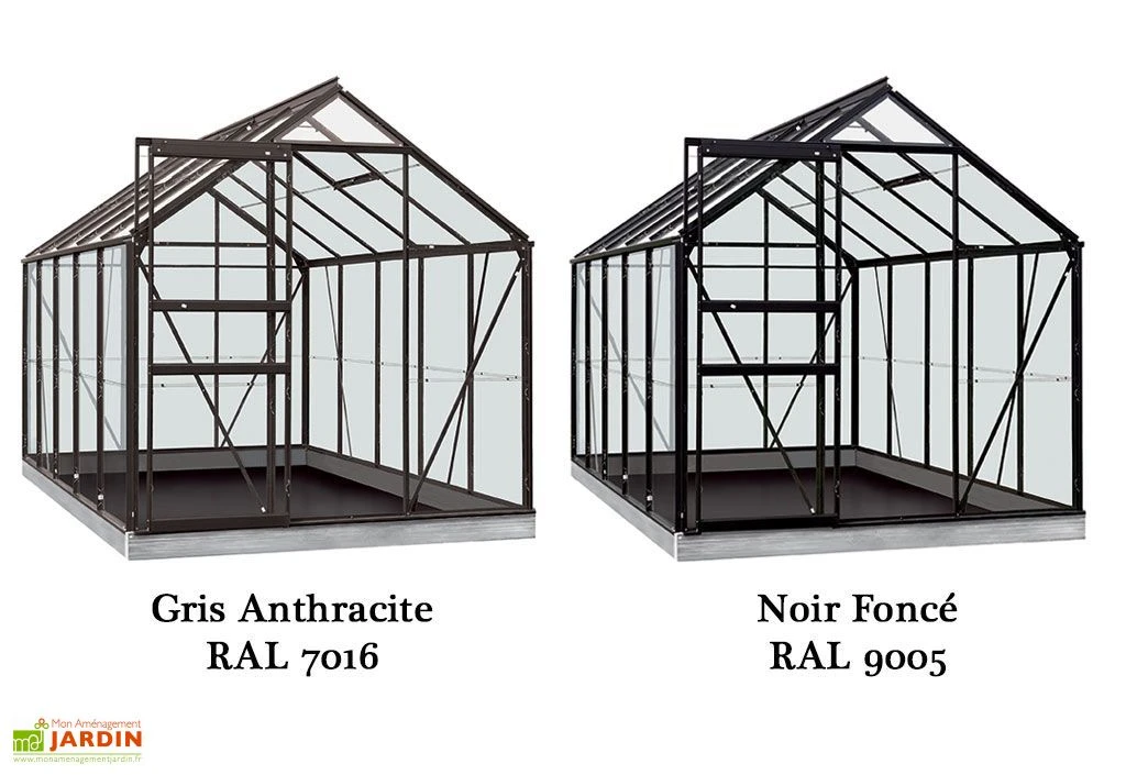 La serre dispose d’une structure en aluminium qui ne demande aucun entretien puisqu’elle résiste parfaitement à la corrosion, à la moisissure et aux attaques d’insectes. La structure est disponible en version brute ou peinte. Les couleurs disponibles sont : aluminium brut, noir foncé RAL 9005, gris anthracite RAL 7016 et vert foncé RAL 6009.