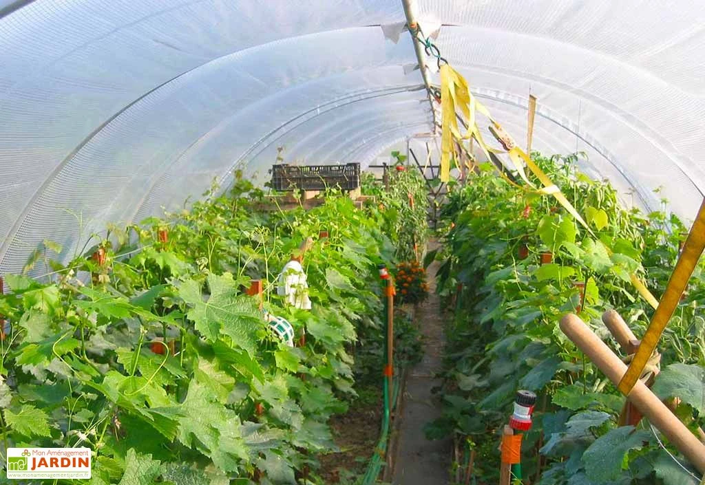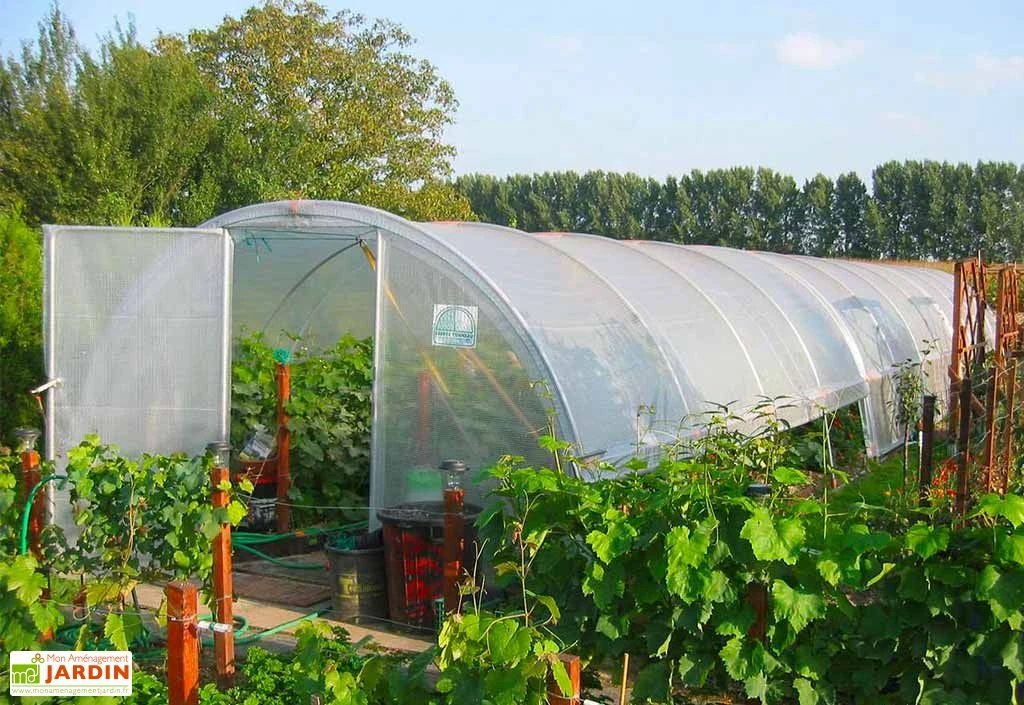 Cette serre maraîchère possède une solide structure composée d’arceaux en acier galvanisé, un matériau robuste qui ne craint pas la rouille (espacement entre chaque arceau : 1,50 m). Ces tubes de 30 mm de diamètre, pour 1,5 mm d’épaisseur, supportent une bâche protectrice en polyéthylène de 200 microns d’épaisseur. Plus écologique que les plastiques plus épais, ce film est tout aussi résistant et fait preuve d’une belle stabilité aux UV. Les pignons de la serre sont quant à eux recouverts de plastique armé transparent Robustex (400 microns).