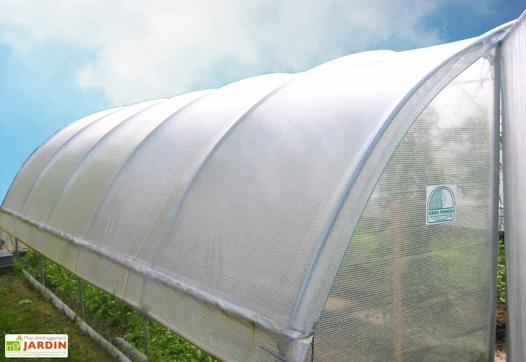 Cette serre tunnel de chez Tonneau est d’origine française. Ses dimensions sont de 7,5 x 4,5 x 2,3 m (l,l,h). Cette grande serre en polyéthylène ne craint pas les UV et assure une bonne transmission de la lumière. Une porte de 1,35 m de large vous permet d’entrer et sortir aisément de votre serre. Une deuxième porte est disponible en accessoire. Il existe deux modèles de serres en option : avec ou sans aération. Le kit manivelles est inclus pour l’option aération.