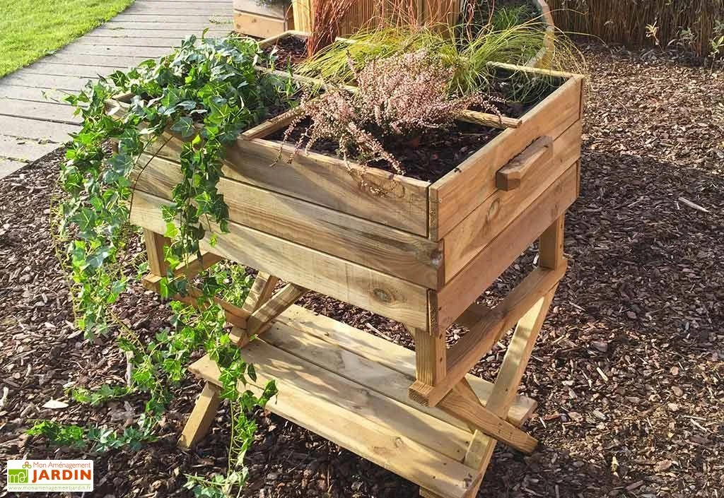 Le carré potage est monté sur pieds et il est réglable en hauteur. Il mesure 80 cm de longueur, 60 cm de largeur et 80 à 100 cm de hauteur. Il est livré avec une tablette et un feutre géotextile de protection.