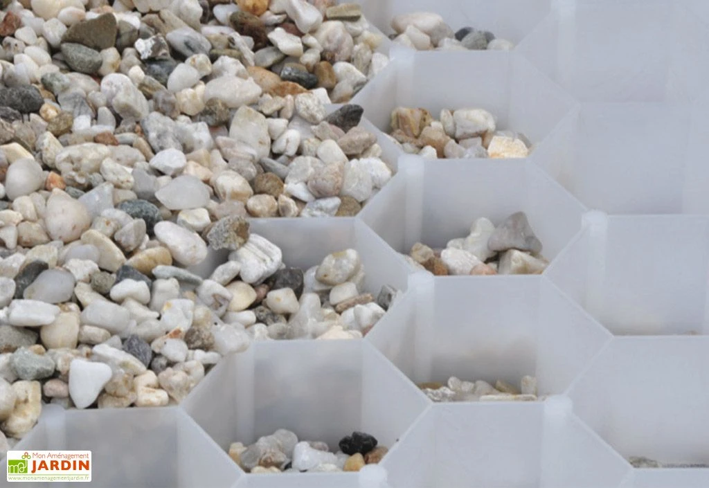 Le tout prend la forme d’un panneau de 117,6 cm de long sur 76,4 cm de large et 3,2 cm d’épaisseur et pourra contenir jusqu’à 75 kg (50 litres) de gravier par m². Il est recommandé d’utiliser du gravier dont le diamètre est compris entre 3 et 15 mm. Une fois rempli, ce stabilisateur témoignera d’une grande résistance, soit 300 T/m² (95 T/m² à vide). Il ne craindra par ailleurs ni le gel, ni les rayons UV.