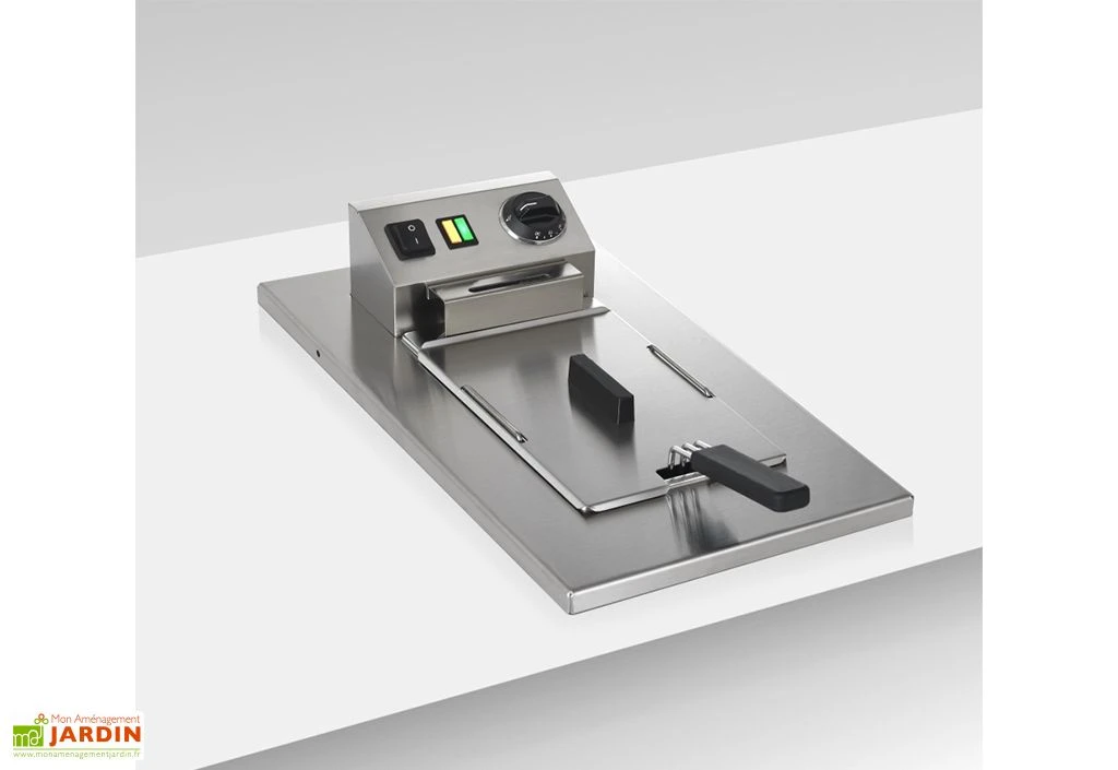 La friteuse électrique (230 V) incluse avec la cuisine extérieure est dotée d’une puissance de 2 300 Watts. Elle est équipée d’un panier en acier chromé avec une poignée athermique et offre une capacité de 4 L d’huile. Cette friteuse en inox mesure 56 x 29 cm, pour 19 cm de haut. Un grand espace de rangement en dessous du plan de travail permet d’entreposer vos ustensiles et produits ménagers par exemple. Il est fermé par une porte en inox maintenue par deux vérins.