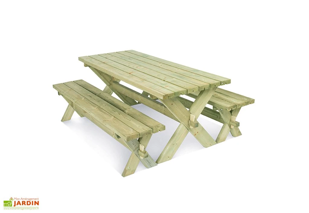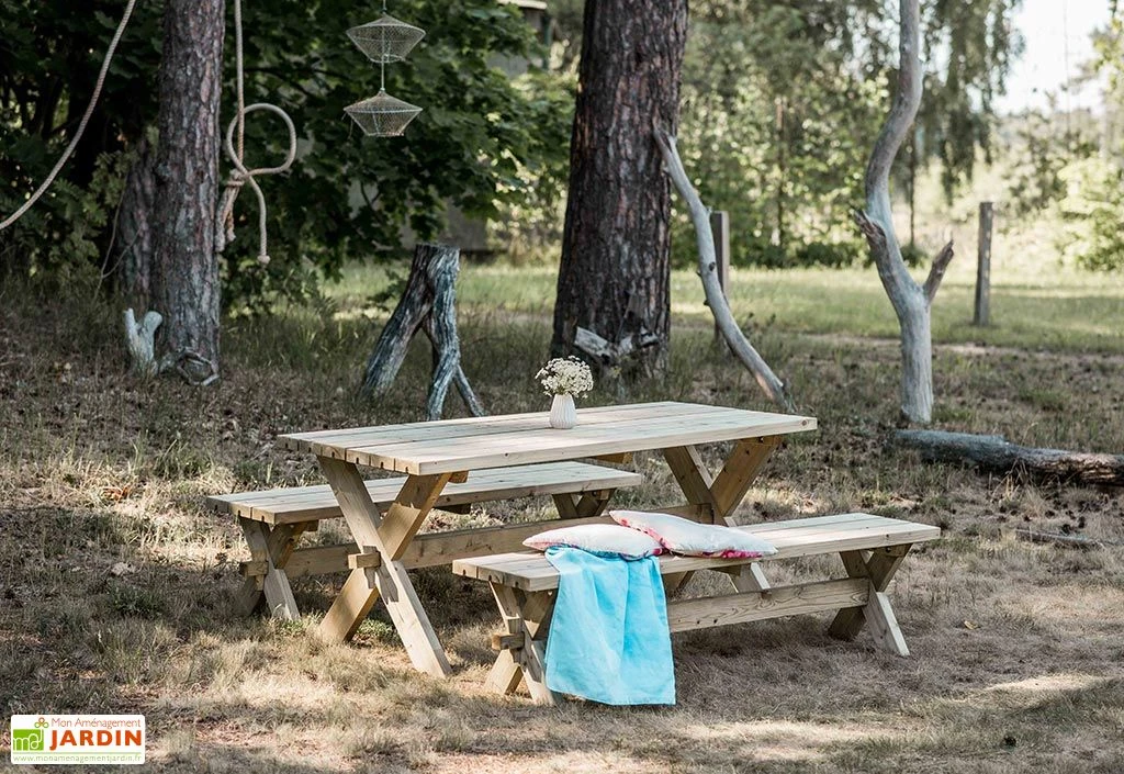 Cette table de pique-nique en bois mesure 177 x 75 cm de côté et 70 cm de hauteur. Les deux bancs qui l’accompagnent mesurent 177 x 37 cm pour 44 cm de hauteur. Ces dimensions sont idéales pour accueillir 4 personnes confortablement. Elle est constituée de planches de 11,6 cm de largeur et de 42 mm d’épaisseur. Les pieds croisés des bancs et de la table confèrent à cette table forestière un charme certain.