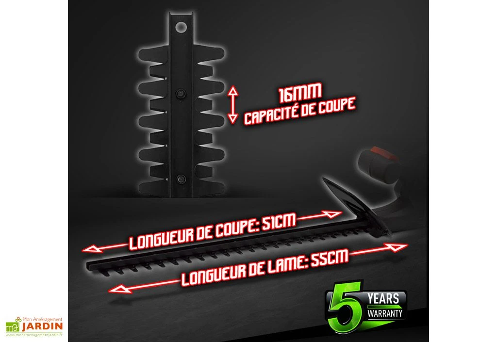 Ce taille haie sans fil 20V Constructor atteint une vitesse à vide de 2200 t/min. Sa lame à double action de 55 cm offre une longueur de coupe de 51 cm et une capacité de coupe de 16 mm.