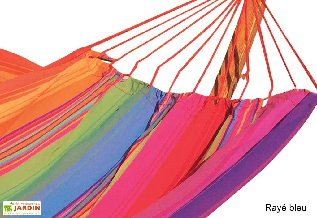 Disponible dans divers coloris au choix, la toile pour hamac Belize de chez Couleurs du Monde arbore un motif rayĂ© haut en couleurs ! Il s’agit d’une toile pour hamac double qui mesure 150 cm de large sur 220 cm de long (longueur totale : 330 cm) et qui pourra supporter un poids maximum de 130 kg.Â