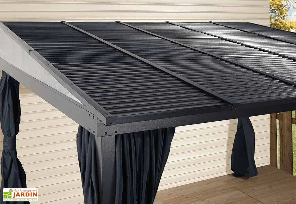 Avec des dimensions de 4,83 x 3,98 m (largeur x profondeur), cette tonnelle adossée couvrira un espace de 14,43 m² que vous pourrez aménager à l’aide d’un salon de jardin, de chaises longues ou d’une table à manger, par exemple. Vous pourrez ainsi profiter de votre terrasse en bénéficiant d’un abri contre le soleil, mais aussi en cas de pluie. Notez par ailleurs que l’inclinaison du toit en acier permet d’assurer le bon écoulement des eaux pluviales pendant une averse.