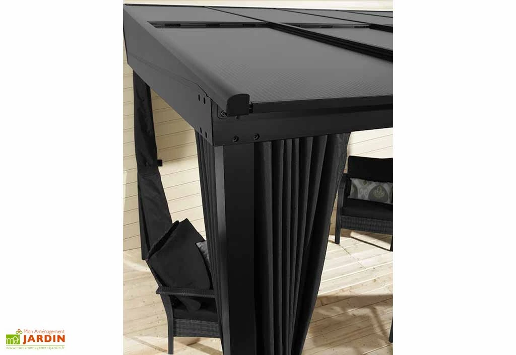 Conçue pour être adossée au mur de votre habitation, cette grande tonnelle Sojag vous permettra d’aménager votre terrasse tout en protégeant votre salon de jardin ou table à manger des intempéries. Elle couvre une surface de 17,53 m² et est livrée accompagnée de rideaux en polyester ainsi que de moustiquaires en nylon. Vous pourrez ainsi profiter pleinement de votre extérieur à l’abri des regards indiscrets et sans être dérangé par les moustiques et autres insectes, notamment les soirs d’été.