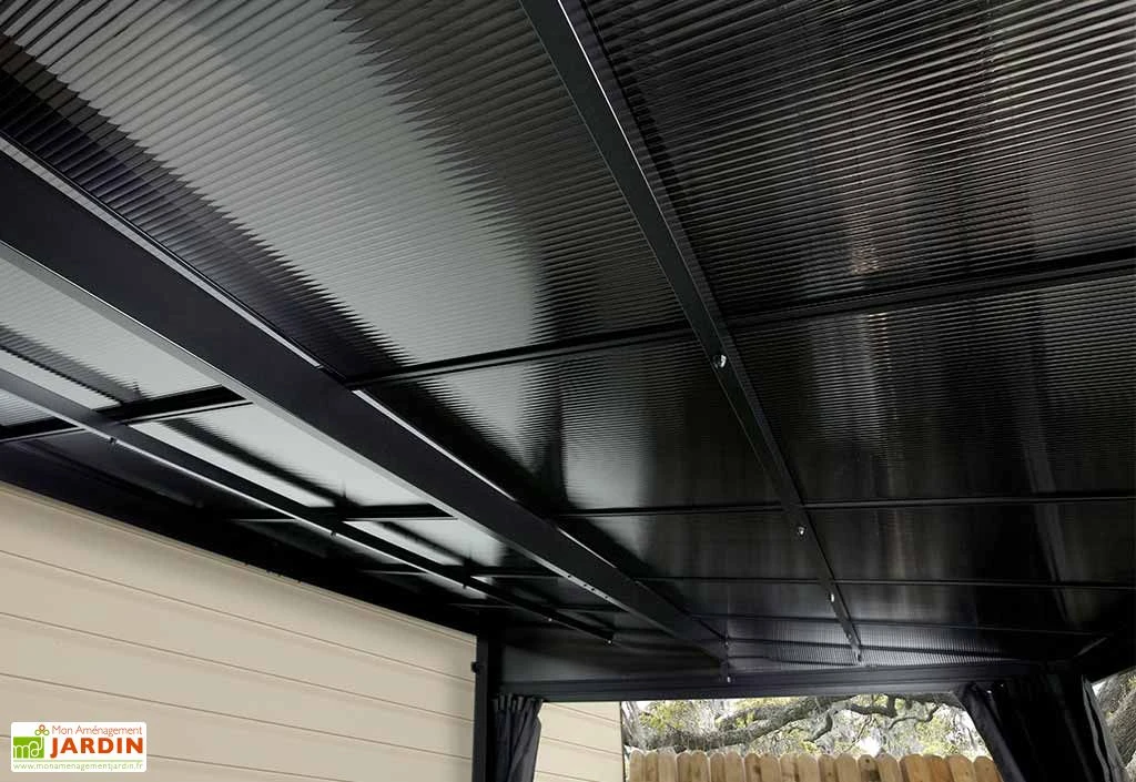 Cette tonnelle murale mobilise une structure en aluminium composée de poteaux de 7,6 cm d’épaisseur. Idéal pour l’extérieur, l’aluminium est un matériau qui ne craint ni l’humidité, ni la rouille, et ce même sans traitement préalable du métal. Cette solide structure soutient un toit en polycarbonate de 8 mm d’épaisseur. Robuste et résistant en cas d’intempéries, le polycarbonate permet également de filtrer les rayons UV. Vous bénéficierez donc d’un abri efficace contre le soleil ou en cas de pluie.