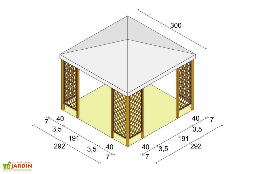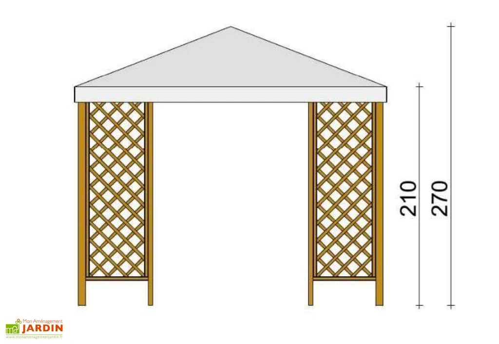 La structure est constituée de treillis décoratifs, chaque panneau mesurant 40 cm de large pour 180 cm de haut. Ils entourent des poteaux de 7 x 7 cm de section qui assurent la bonne stabilité de la tonnelle.