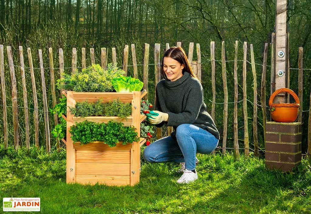 Pensé pour être installé dans les petits jardins ou les balcons, ce potager surélevé offre trois étages de 65 cm de côté et affiche une hauteur totale de 73 cm. Vous pourrez donc jardiner sans avoir à vous pencher, et ce même si vous ne disposez que peu d’espace. A noter également, la présence de lattes latérales inclinables conçues pour profiter d’une surface de culture légèrement plus grande.
