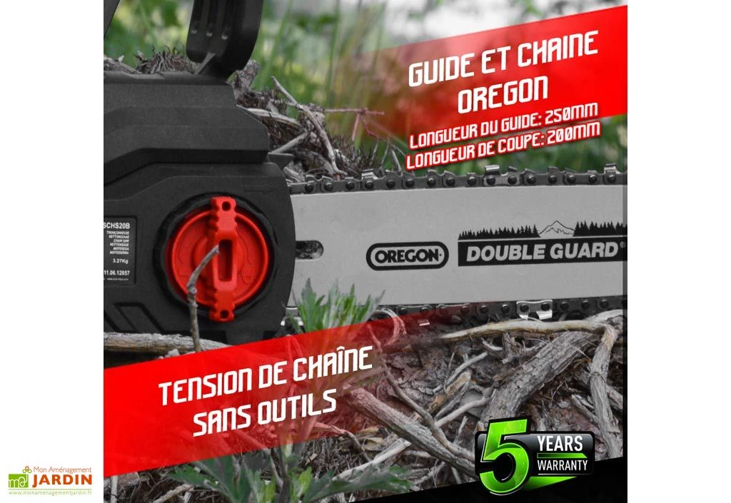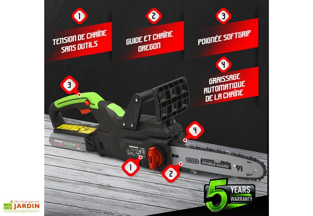 Cette tronçonneuse à batterie est garantie 5 ans.
