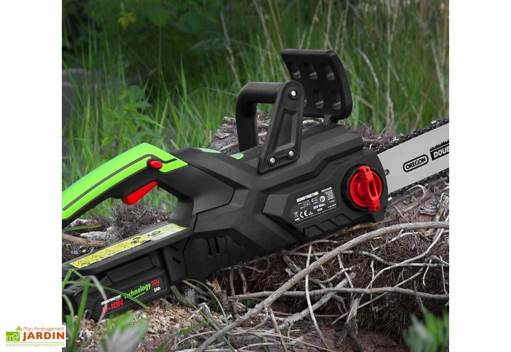 La tronçonneuse sans fil 20V de Constructor est idéalement conçue pour la coupe de bois de chauffage ou pour entretenir les jardins. Grâce à son guide Oregon d’une longueur de 25 cm, elle offre une longueur de coupe de 20 cm. Cette tronçonneuse à batterie bénéficie d’un réservoir d’huile d’une capacité de 160 ml.