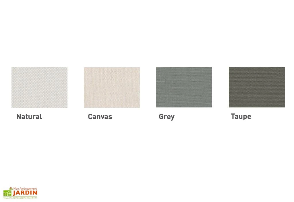 La toile en acrylique possède une épaisseur de 250 gr/m². Elle est teinte, et disponible dans 4 coloris à choisir selon vos envies. Cette toile bénéficie d’une résistance aux UV de classe 8. Elle vous protège donc des rayons nocifs du soleil tout étant elle-même protégée d’une décoloration et d’une usure prématurées.