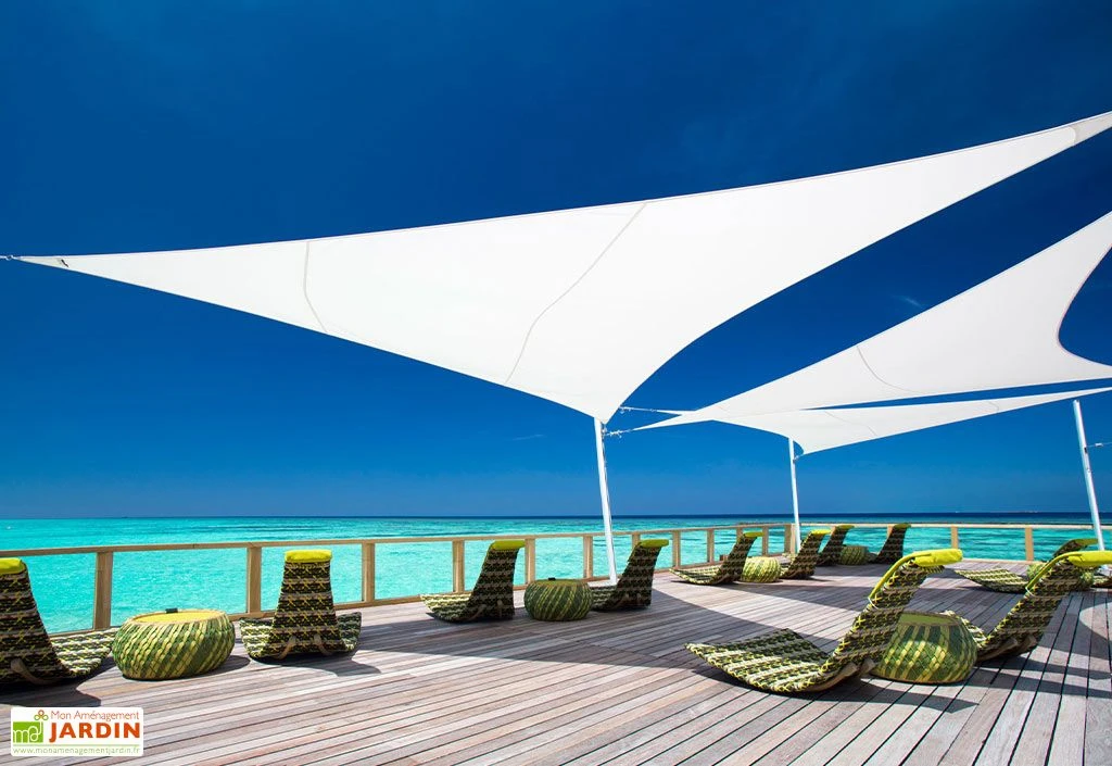 La voile d’ombrage Ingenua de chez Umbrosa est fabriquée en Belgique. Elle est triangulaire et mesure 5,00 m de chaque côté, permettant d’apporter une grande surface d’ombre dans le jardin.
